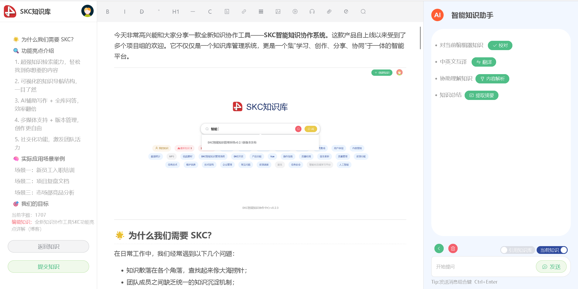 在线创建和更新知识时可以通过AI模型进行辅助创作,如内容翻译、内容扩写、 内容校对等辅助功能。同时还可通过AI为知识自动选取分类和标签。