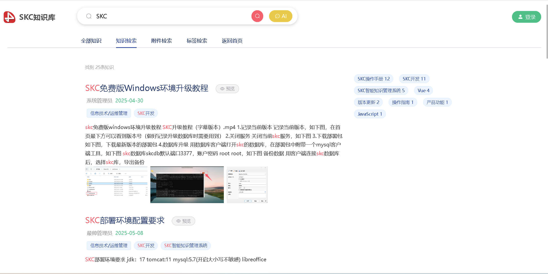 可依据知识或附件内的任意关键字进行检索知识,可以依据知识的标签 / 分类 / 标题等进行检索。在此基础上还提供语义检索和范围检索,在检索结果上进行二次筛选等。