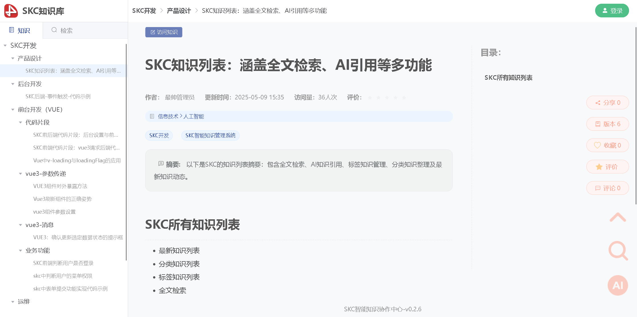 用户可以对知识内容进行评价 / 评论 / 收藏 / 分享,每篇知识的更新均有版本记录不必担心应用户积极参与知识更新而产生错误,可以将知识回滚到任意版本.