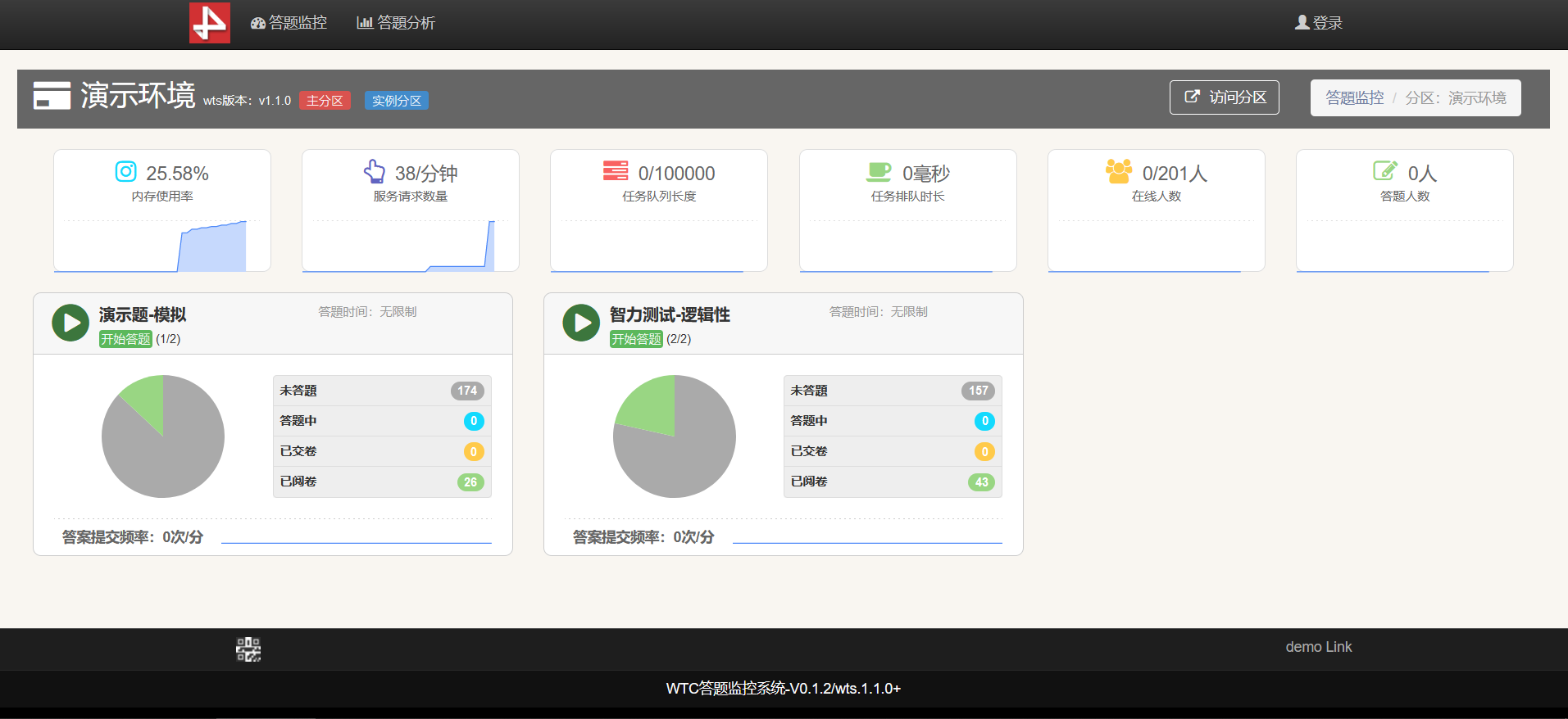 通过监控界面,实时监控答題服务状态,在线人数、答題人数、每个答题室中答卷完成状态等。