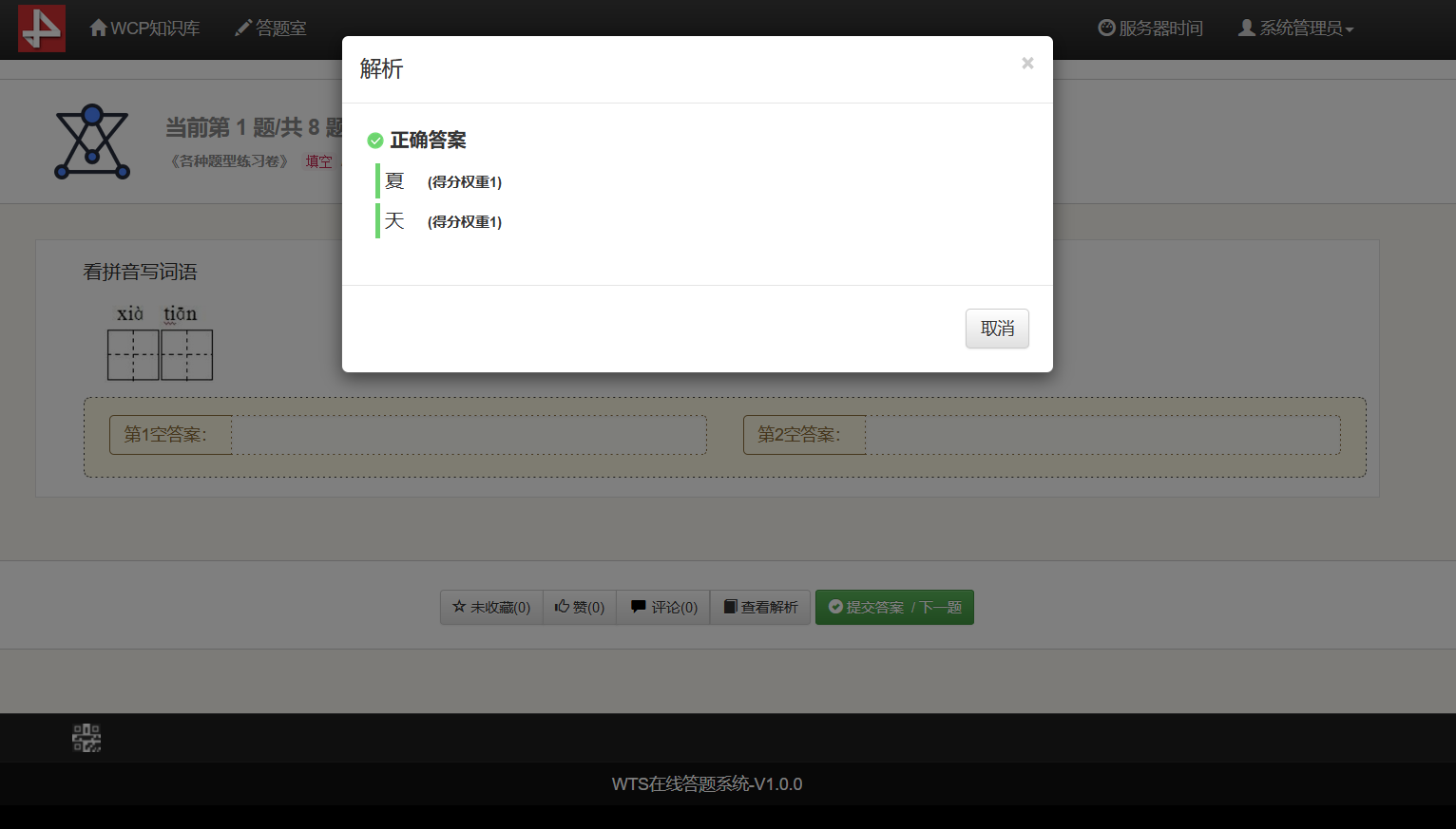 用戶在答题室中随机抽取本答题室中的题目进行题目练习,在练习过程中可随时查看答案和终止练习,系统实时显示练习结果和正确情况。