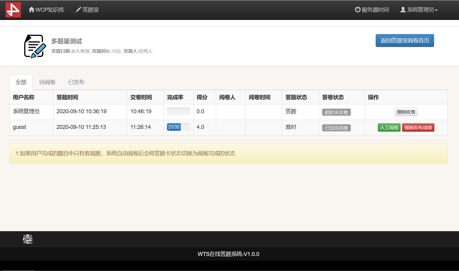 客观题系统自动进行阅卷打分,主观题系统辅助人工进行阅卷打分,当用户所答题目全部是客观题时可实时发布分数。